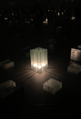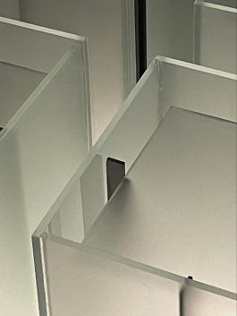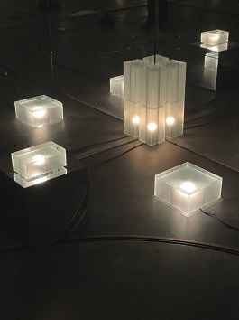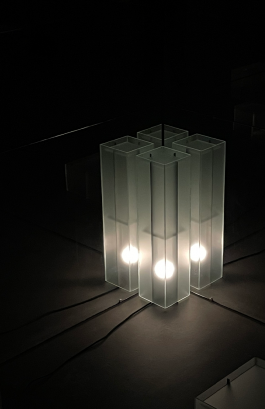 Four panes of satin glass form a mantle around a filigree cross connection made of brushed steel. Light breaks diffusely from the milky glass body and bathes the room atmospherically in golden nuances. The luminaire has a sculptural effect and reveals the graphic outlines of the metal structure, which are transferred to the room as a shadow. The „FUME“ lamp is dimmable and comes in three sizes: A monolithic tower, a harmonious cube and a compact cuboid. Through their unconventional shapes and sizes each lamp is not bound to a specific spatial context and could be used both as a table and floor lamp or an enlighting body in a shelf.